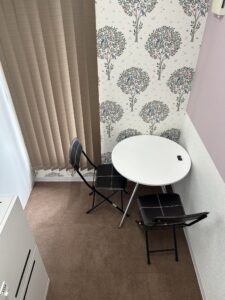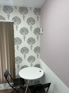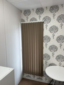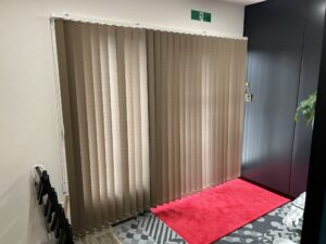 休憩室ですので、落ち着いて休めるような縦型ブラインドの色味にしています。